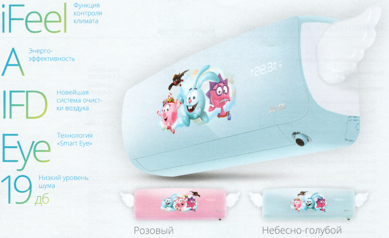 Детская серия кондиционеров AUX обладает не только прогрессивной технической начинкой, но и уникальным дизайном внутреннего блока. Умный датчик температуры «Smart Еуе» самостоятельно отслеживает температуру в различных точках помещения и автоматически поддерживает заданные параметры. К примеру, если ребёнок во сне сбросит одеяло, то кондиционер автоматически определит это, и повысит температуру в зоне, где спит ребёнок. Также он снизит скорость воздушного потока, для того, чтобы сон ребёнка оставался крепким и непрерывным. Функция «Родительский контроль» позволит родителям не волноваться, что ребёнок в процессе игры изменит настройки работы прибора. Режимы работы: охлаждение, обогрев, осушение, вентиляция, авторестарт, противогрибковая функция, 3 режима вентиляции, турбо режим, дисплей «Мираж+», интеллектуальная разморозка, самоочистка, DC-inverter, самодиагностика 360°, функция защиты от утечки фреона, режим глубокий сон, таймер, iFeel, идентификация кода неисправности, антикоррозийное покрытие Blue Fin, защита от перепада напряжения, выключение дисплея с пульта ДУ, компрессор GMCC, wi-fi (опция).