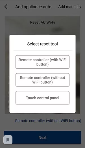 Если у вас пульт «With WiFi button» — подключение происходит следующим образом — удерживайте на пульте управления кнопку wi-fi и mode около 1 секунды, в приложение нажмите кнопку Next, подключитесь к сети Wi-fi и выполните поиск кондиционера.