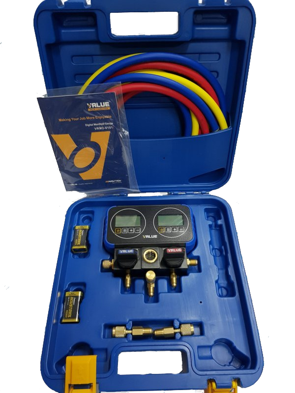 Электронный двухвентильный манометрический коллектор Value VRM2-0101I в комплекте с зарядными шлангами 150 см (желтый, синий, красный) и двумя переходниками: 5/16 – 1/4 SAE. Красный: 1/4 ”-5 / 16”; желтый: 1/4 "-1 / 4"; синий: 1/4 ”-5 / 16”. Зарядные шланги имеют резиновые уплотнительные прокладки и переходные резьбы на красном и синем шлангах (присоединение к манометрическому коллектору - 1/4 SAE, присоединение к оборудованию - 5/16 SAE).Электронный коллектор поставляется в прочном пластиковом кейсе и может работать со всеми основными фреонами: R410A, R22, R134A, R407C, R404A, R507, R32, R290, R1234yf.